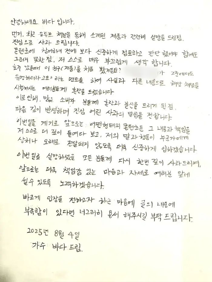 최근 가수 바다는 한 뷰티 유튜브 채널에서 특정 화장품을 소개하며 "호주 갔을 때 처음 봤다"고 언급했다. 하지만 해당 제품이 실제 호주산이 아니라는 의혹이 불거지며 허위 광고 논란의 중심에 섰다.