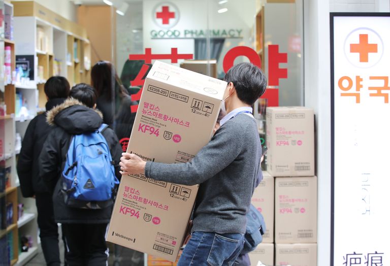 27일 서울 시내 한 약국에 마스크 상품 이 박스째 옮겨지고 있다. 신종 코로나바이러스가 확산한 이후 약국에선 마스크 판매량이 급증했다. /연합뉴스