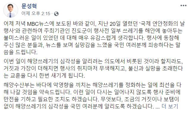 문성혁 장관은 진도에서 있었던 일과 관련해 사과문을 올렸다. /문성혁 장관 페이스북 캡처