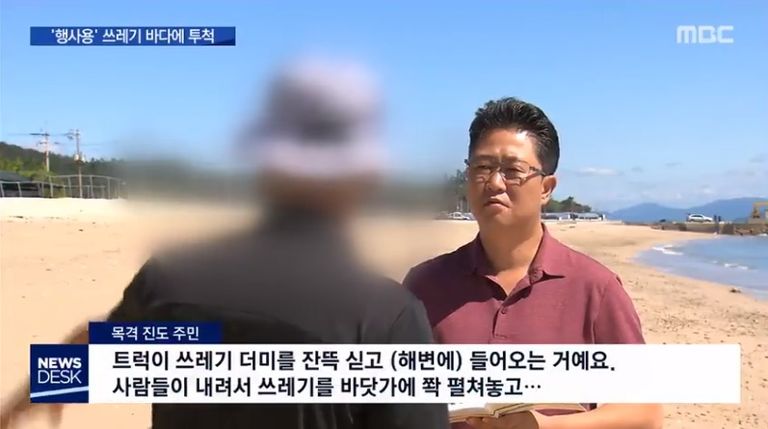 진도군은 바다 정화의 날 행사를 위해 쓰레기를 미리 모아두었다가 행사 전 뿌려놓은 것으로 알려졌다. MBC 취재진과 대화 중인 목격 주민. /MBC 캡처