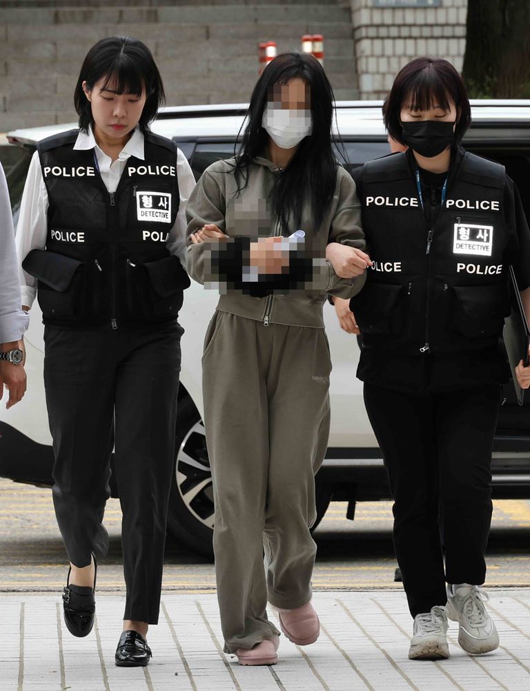 축구 국가대표팀 주장 손흥민의 아이를 임신했다고 주장하며 손씨에게 돈을 뜯어내려 한 20대 여성 양모씨가 17일 영장실질심사를 받기 위해 서울중앙지법에 들어서고 있다. /연합뉴스