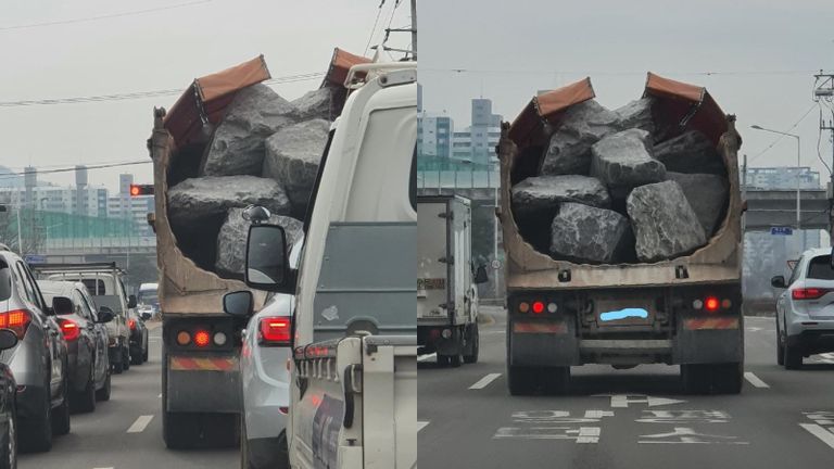 수위 높은 비난이 한 덤프트럭에 향하고 있다. 지난 4일, 한 인터넷 커뮤니티에 올라온 사진이 발단이었다. 사진 속 트럭은 거대한 바위를 잔뜩 싣고 도로를 달리고 있었다. 바위 크기는 큼지막한 트럭 바퀴보다도 컸다. 문제는 바위를 고정하는 끈이나 덮개 같은 안전장치가 전혀 없었다는 것. 운전자 A씨가 운전 방향을 급하게 바꾼다면 바위는 도로로 굴러떨어질 수 있었다.