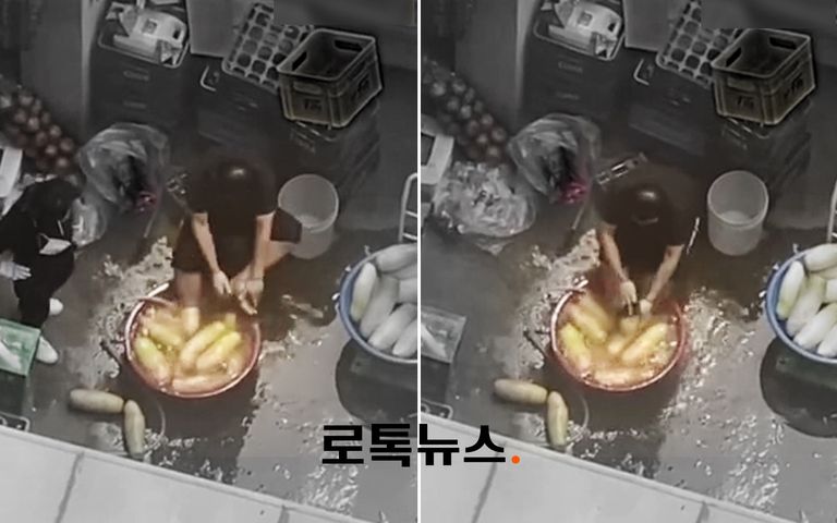 무가 가득 담겨있는 빨간색 대야. 한 남성이 양쪽 발을 대야에 담근 채 무를 씻었다. 그러더니 무를 씻던 수세미로 자신의 발바닥을 '벅벅' 닦았다. 무를 닦고, 발도 닦은 이 수세미는 다시 대야로 직행했다.