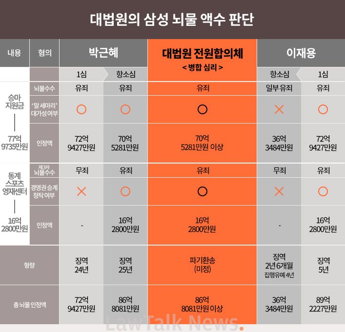 하지만 이날 대법원은 앞선 재판의 결론을 모두 깨뜨렸다. 말 구입비는 뇌물이 맞고, 영재센터 지원금 16억원도 박 전 대통령에 준 뇌물이 맞는다고 판결했다. 이로써 이 부회장에게 적용될 뇌물 액수는 총 86억 8081만 원 이상이 됐다. 현행법상 뇌물액이 50억원이 넘을 경우 무기징역 또는 5년 이상의 징역이어서 판사가 직권으로 형을 줄여주지 않는 한 집행유예 선고는 어렵다.
