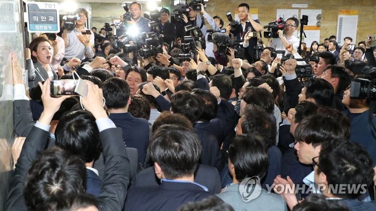 지난해 4월 25일 당시 자유한국당 나경원 원내대표와 한국당 의원, 보좌진들이 국회 의안과 앞에서 경호권발동으로 진입한 국회 경위들을 저지하며 헌법수호를 외치는 모습이다. /연합뉴스