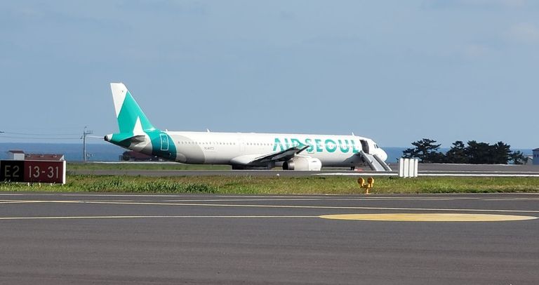 제주공항에 비상문이 개방된 채로 서 있는 에어서울 여객기