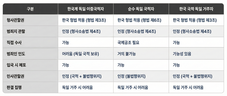 마지막으로 A씨가 한국 국적자이면서 독일 영주권만 가진 '재외국민'인 경우다. 이때는 시나리오 1과 마찬가지로 '속인주의'가 적용되어 한국 경찰이 수사 주도권을 쥘 수 있다.