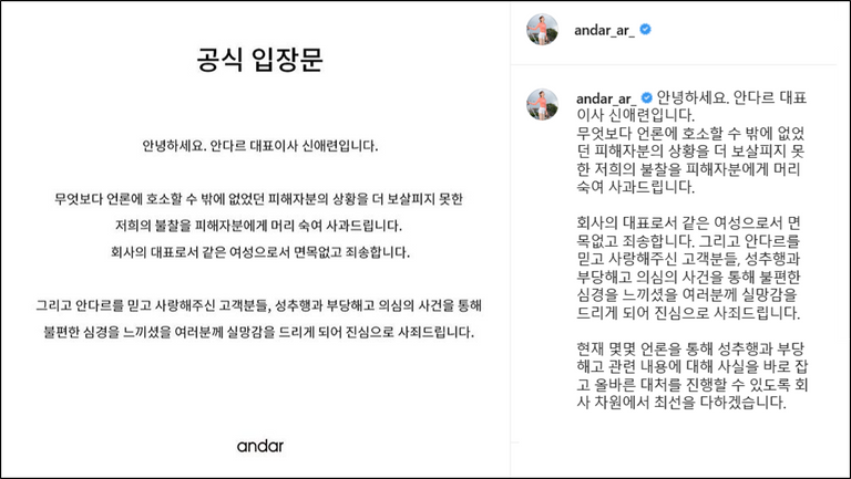 안녕하세요. 안다르 대표이사 신애련입니다. 무엇보다 언론에 호소할 수 밖에 없었던 피해자분의 상황을 더 보살피지 못한 저희의 불찰을 피해자분에게 머리 숙여 사과드립니다.