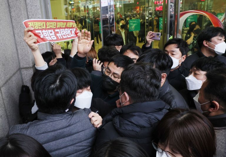 목 조르고, 팔⋅다리 잡고 질질…유세 현장 시위자 폭행, 어떻게 처벌될까