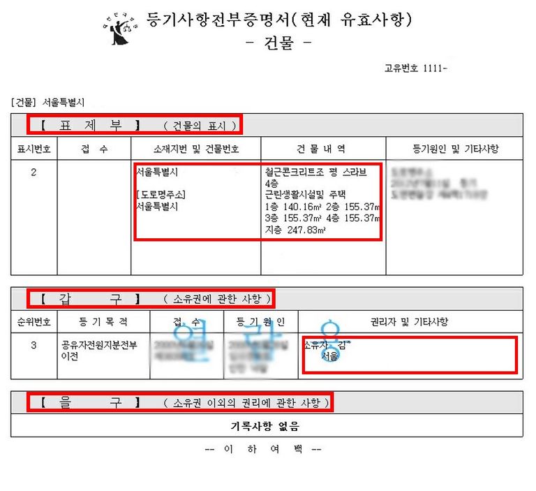 등기부등본 예시 이미지. 표제부와 갑구, 을구에서 각각 확인해야 할 점이 있다. /독자 제공