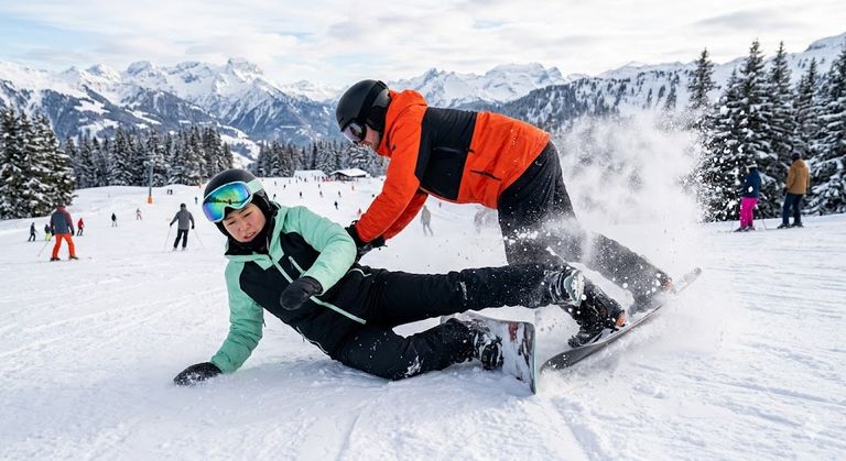 연말 스키장에서 후미 보더와 충돌해 A씨의 아내가 척추 골절 중상을 입었으나, 가해자는 책임을 회피하고 있다. / AI 생성 이미지
