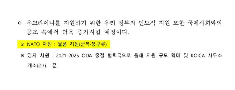 러시아의 침공으로 위기에 처한 우크라이나에 정부가 군복 등 군용품을 지원할 방침이라고 밝혔다. 외교부는 지난 28일 보도자료를 통해 위와 같이 발표했다. 외교부 관계자는 "국제사회의 일원으로 책임 있는 조치를 다하겠다는 입장에 따라 군복과 장구류를 지원하기로 했다"고 설명했다.