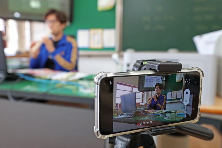 초·중·고교가 2차 온라인 개학한 16일 광주 북구 한 초등학교 6학년 교실에서 교사가 음악 수업에 활용할 동영상을 제작하고 있다. /연합뉴스