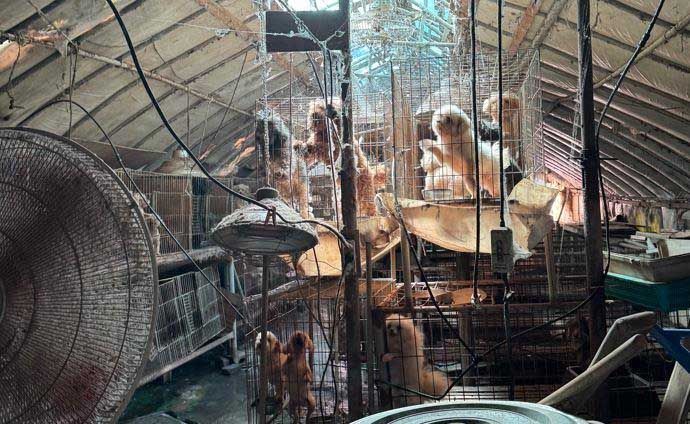 악취가 진동하는 비닐하우스 안에는 다층으로 쌓인 케이지들이 있었고, 그 안에 소형견부터 대형견까지 58마리가 갇혀 있었다.