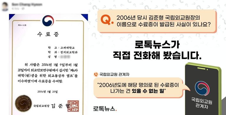 국립외교원 관계자도 이날 로톡뉴스와 통화에서 "2006년도에 김준형 원장 명의의 수료증이 나가는 건 있을 수 없는 일"이라며 황당해 했다. 오히려 기자에게 "그 사람(손씨)은 대체 누구냐"며 되물었다.
