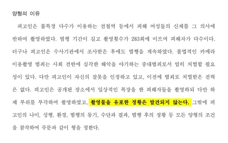 사실 법조계 일각에선 "유포하지 않았다"는 걸 선처 사유로 제시하는 것에 대해 "바람직하지 않다"고 비판이 나오고 있다. 우리 법은 엄연히 '불법촬영'과 '반포(배포)'를 각각의 범죄 행위로 구별하고, 처벌하고 있기 때문. 그런데도 위와같은 식으로 선처하는 건 "성추행을 했지만, 성폭행을 한 건 아니므로 선처한다"는 것과 비슷하다.