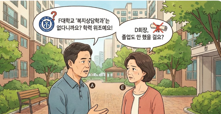 갈등의 불씨는 D씨의 '학력' 문제였다. D씨는 F대학교 사회복지과에서 복지상담을 전공했으나, 2023년 7월 게시된 동대표 후보자 등록 공고에는 학력이 'F대 졸업(복지상담학과)'라고 기재되어 있었다. 문제는 실제로 F대학교에 '복지상담학과'라는 명칭의 학과는 개설되어 있지 않다는 점이었다.