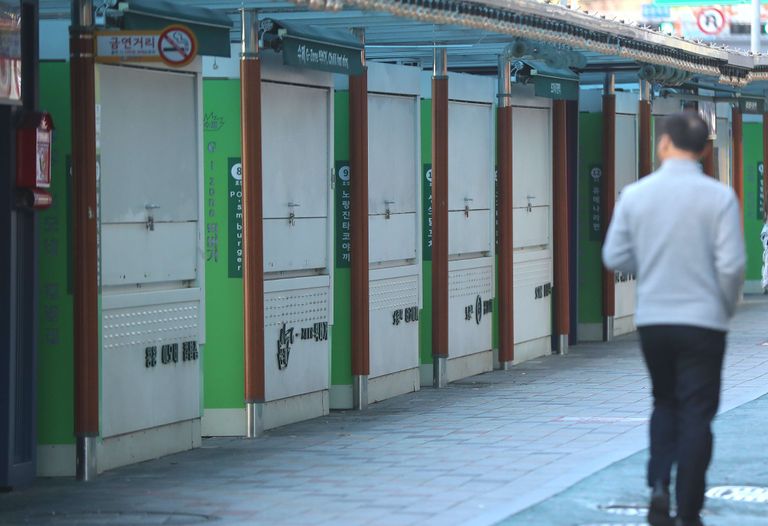 지난 23일 서울 동작구 노량진 컵밥거리 가게들이 문을 닫은 채 영업하지 않고 있다. 노량진 임용고시 관련 누적 확진자는 81명에서 24일 88명으로 증가했다. /연합뉴스