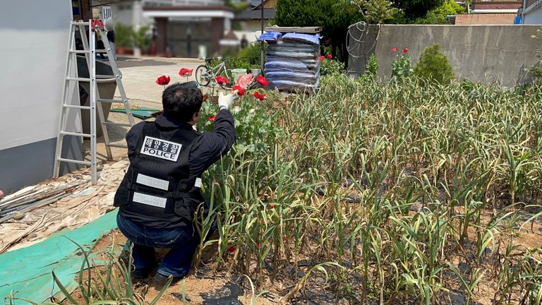 경남 사천해양경찰서가 양귀비 불법 재배를 단속하는 모습. /연합뉴스