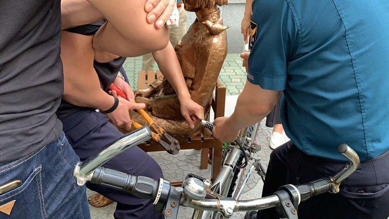이후 동부경찰서 소속 경찰 B씨는 A씨 자물쇠 일부를 절단했다. 옆에서 현장을 지켜보던 A씨는 자전거를 가지고 평화의 소녀상 주변을 떠났다.