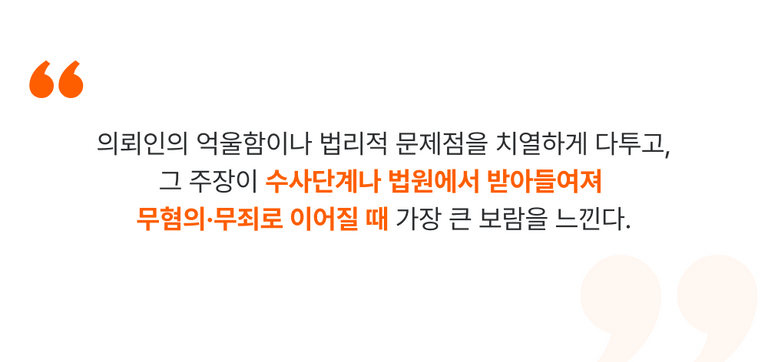 수사관으로 사건을 파헤쳤던 경험, 대형 로펌에서 쌓은 변론 노하우, 그리고 의뢰인과의 신뢰를 최우선으로 하는 원칙.