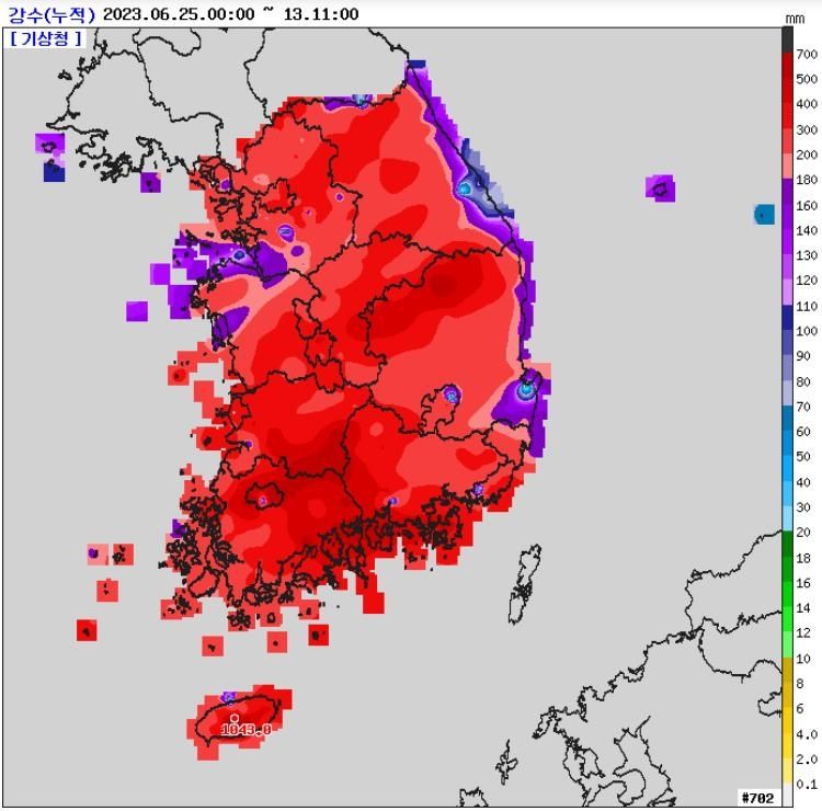 15일까지 예상 강수량은 중부지방(강원 동해안 제외), 전북, 경북 북부 내륙에 100~250㎜다. 특히 충남권, 전북에는 400㎜ 이상, 경기 남부와 강원 남부 내륙·산지, 충북, 경북 북부 내륙에는 300㎜ 이상의 많은 비가 쏟아지겠다.