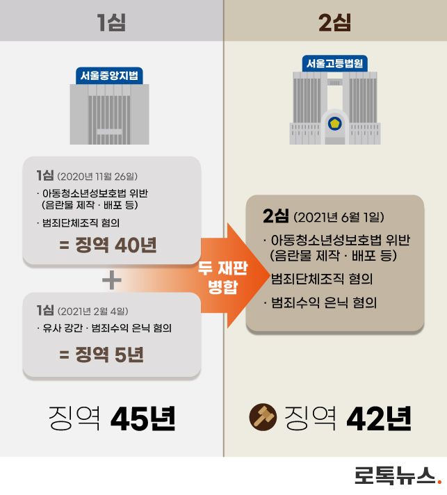 이후 지난 2월에는 박사방을 통해 벌어들인 수익을 은닉한 혐의(③)로 징역 5년이 추가됐다. 그렇게 앞서 선고된 징역 40년까지 더해 총 45년의 징역형이 선고됐다.