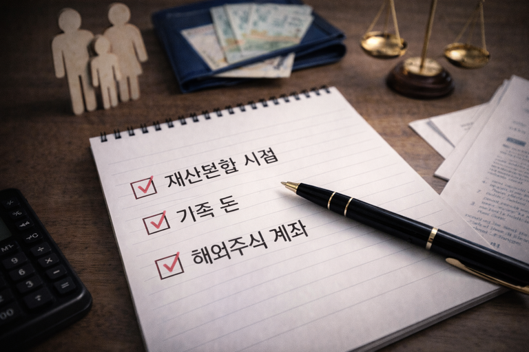 조정이혼 결렬 후 소송 시 재산분할 기준 시점과 가족 돈·해외 주식의 분할 여부에 대한 전문가들의 명쾌한 답변.