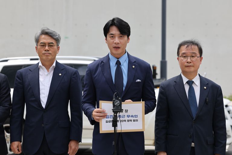 더불어민주당 정치검찰 조작기소대응 태스크포스(TF) 한준호 단장 및 의원들이 8일 서울 종로구 KT 광화문빌딩에 마련된 김건희 여사 관련 의혹을 수사하는 민중기 특별검사팀 사무실에 김성태 전 쌍방울 회장 보석 석방 관련 고발장 제출하기 앞서 기자회견을 하고 있다. /연합뉴스