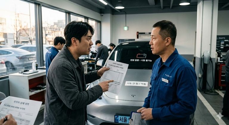 미국에서 들여온 테슬라 차주가 보증 수리 거부 후 유상 수리를 맡겼으나, 서비스센터의 과실로 차가 시동조차 걸리지 않는 '먹통'이 됐다. / AI 생성 이미지