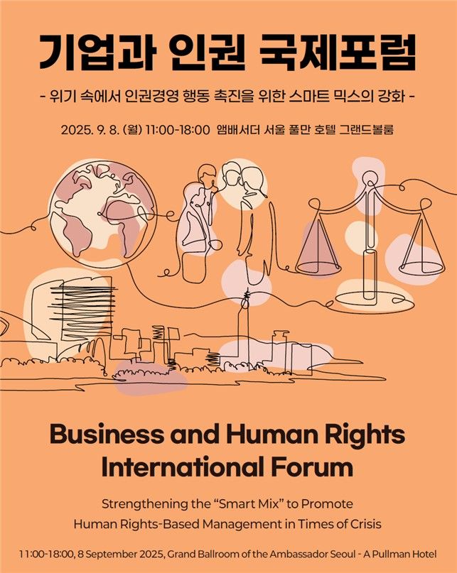 8일 서울 중구 앰배서더 서울 풀만 호텔에서 열리는 이번 포럼은 글로벌 공급망 다변화와 AI 기술 확산 등 새로운 시대적 과제 속에서도 기업이 인권 존중 책임을 다해야 한다는 인식 아래 '위기 속에서 인권경영 행동 촉진을 위한 스마트 믹스(Smart Mix)의 강화'를 주제로 마련됐다.