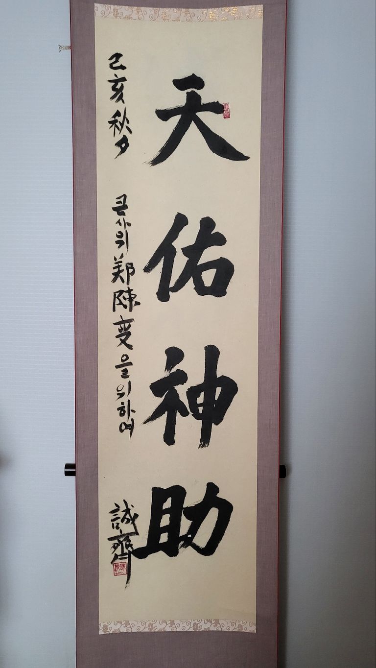 늦게나마 제가 '자유와 사랑'을 바탕으로 한 인간정신의 위대한 측면을 깨닫고 받아들여서, 이런 공부의 성과를 조그만 글로 써서 내놓게 된 것은 내 삶의 천행(天幸)이자 천우신조(天佑神助)와 같은 일이 아닐 수 없습니다(위의 '천우신조' 족자는 올해 93세 되신 장인어른께서 몇 년 전 추석 선물로 써주신 글귀입니다).